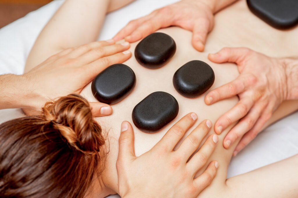 Masaje que combina piedras calientes y técnicas manuales para relajar, mejorar la circulación y aliviar tensiones.